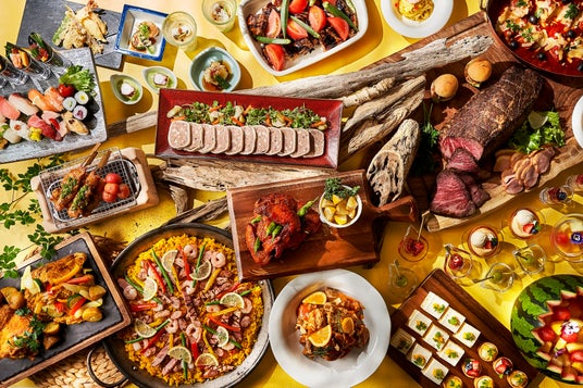 パテ・ド・カンパーニュ/生ハム/牛肉のタリアータ/玉子豆腐と湯引き蛸 ずんだ餡/炙り〆鯖とこんぶ野沢菜/オクラとほぐし鶏の胡麻和え/黒酢酢豚/牛肉のピッツアイオーラ/バッファローチキンウイング/イカとセロリの塩炒め/ローストビーフ/ホテルオリジナル引き立てコンソメスープ/スペアリブ/牛肉のグリル キムチ添え/国産牛肉のしゃぶしゃぶ/パエリアワゴン(土日祝限定)/鮑の蒸し焼き(土日祝限定)/産地直送握り寿司/手巻き寿司/天ぷら/香ばし焼き味噌ラーメン/いくらボール(土日祝限定)