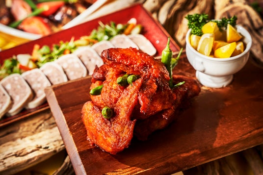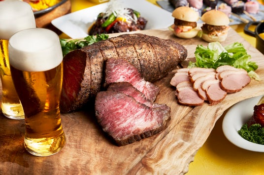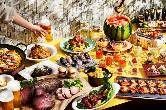 贅沢に国産牛肉を使用したしゃぶしゃぶ、醤油の甘辛さやチリソースの味付けがアクセントの手羽先、じっくりと旨みを凝縮させ柔らかく仕上げたスペアリブなど肉料理の数々と、店内に広がるジューシーで香ばしく焼き上げられたお肉の香りが食欲をそそります。新鮮なサラダやスープ、人気の和食メニューもご用意し、お肉以外のメニューもバランス良くお楽しみいただける内容です。また、土日祝のディナータイムには出来立てのパエリアをお席までワゴンサービスにて提供します。ビールと相性抜群なメニューも豊富で、お好みでお飲物のフリーフローもお選びいただけます。
