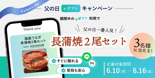 厳選した国産うなぎ通販専門店「大五うなぎ工房」を展開する大五通商株式会社(本社所在地:静岡県静岡市、代表取締役社長:瓦谷 健)は、LINEやSNSのダイレクトメッセージ、またはメールなどで気軽にギフトを贈ることができる「eギフト」の父の日キャンペーンを実施いたします。キャンペーン期間中(2024年6月10日~6月16日)にeギフトをご利用のいただいた方の中から抽選で父の日人気商品をプレゼントいたします。