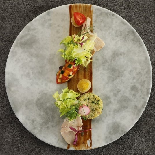 中央にバルサミコソースで川を描き、川から桃が流れてくる様子をイメージした、桃太郎の冒頭のワンシーンになぞらえた一皿。夏野菜を使用したトマトの旨味をたっぷりと感じられるラタトゥイユに、燻製にした香り高い桃太郎ポークのハムを合わせて、旨味と酸味の調和をお楽しみください。