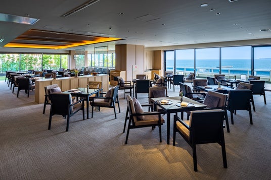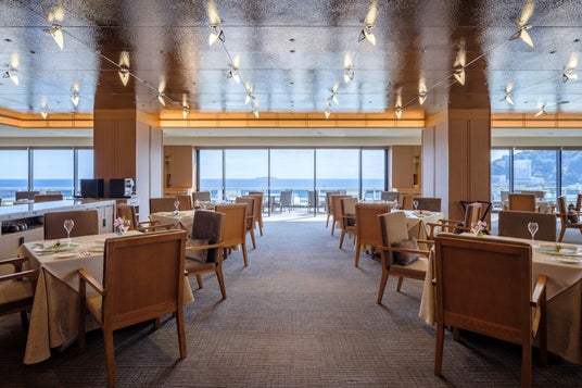そしてテラスのある6Fには、熱海の海を背景にフレンチ、日本料理、鉄板焼、寿司、メインバーが仕切られることなく集まったシームレスなダイニングフロアがあります。この地だからこそ味わえる旬の食材に彩られた伊豆半島や熱海の四季折々の味覚を季節感あふれる味わいでお楽しみいただけます。