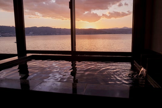 露天風呂付き客室の温泉から望む夕刻の諏訪湖