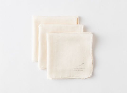 オーガニックコットン100%のダブルガーゼハンカチ。やわらかな肌触りに仕上げています。沐浴のときにやさしくお肌を洗ったり、お口を拭うなど、なにかと便利な3枚セットです。