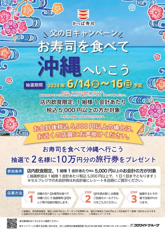 1 つ目は、「お寿司を食べて沖縄にいこう」と題して、店内飲食限定で1組様1会計あたり税込5,000円以上のお会計の方を対象に、抽選で2名様に10万円分の旅行券をプレゼントいたします。