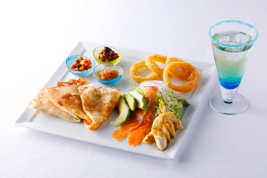 スパイスで香り付けした蒸し鶏やサーモンのマリネ、アボカドを3種類のオリジナルソースと一緒にもちもち食感に焼き上げた米粉のクレープに包んでお召し上がりください。横浜の海をイメージした青いサラトガクーラーと相性抜群です。