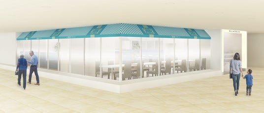 資生堂パーラーのロゴをあしらったテントのデザインを一新しました。目を惹くような色鮮やかなブルーが特長です。