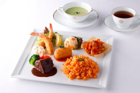 資生堂パーラーの人気定番メニューのミートクロケットやトマトマカロニグラタンをはじめ、海老フライ、ポテトサラダ、長時間煮込んで柔らかく仕上げた牛ホホ肉の赤ワイン煮込み、アメリケーヌソースの濃厚な味わいが特長のズワイガニのピラフなど、盛り沢山のメニューをワンプレートに仕立てました。