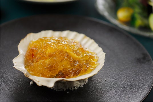 岩手県三陸の泳ぐ帆立と夏野菜のコンソメジュレ