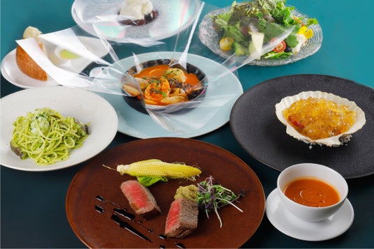 25種類のお野菜とハーブを使用した彩り華やかなサラダ、京都の夏の風物詩 鱧を使用したジェノベーゼや旬のお野菜を付け合わせた和牛のビステッカなど、夏の味覚を味わいながら満足感のある構成でお愉しみいただけます。