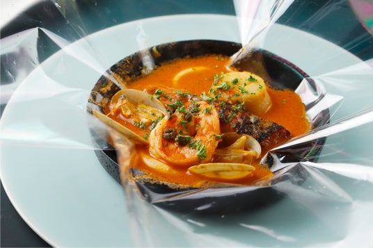 岩手県三陸を泳ぐ帆立は、海水の中で生きたまま届く新鮮なものを使用。軽く火をいれて夏野菜と合わせ、爽やかな酸味を感じるコンソメジュレでさっぱりと。トスカーナの魚介煮込み料理「カチュッコ」は、カルタファタに包んで熱々をご提供します。