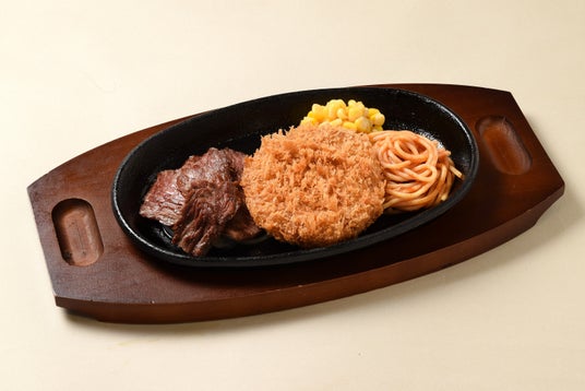 創業の味てっぱんステーキと、宮メンチのコンボメニュー。宮メンチは、自家製ハンバーグを使用し、店舗で一つ一つ丁寧に仕込み、揚げたてを提供します。牛肉と豚肉の絶妙な比率とバランスにこだわった自家製ハンバーグを使う事で、実現する肉汁のジューシーさ、衣のサクサク加減がたまりません。