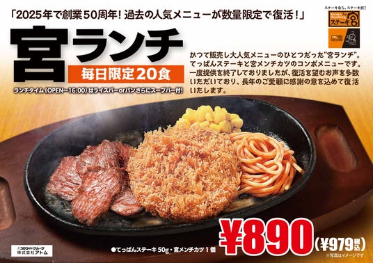 また、かつて好評だったランチメニュー「宮ランチ¥890(¥979税込)」も毎日20食限定で、全店で販売開始いたします。より多くの皆様に楽しんでいただけることを心より願っております。お近くのステーキ宮でお待ちしております。