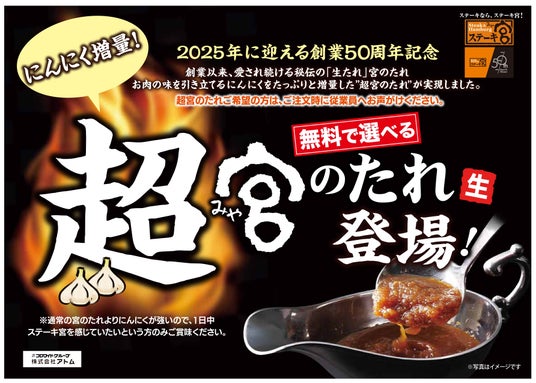 ステーキ宮といえば、宮のたれ!創業以来、愛され続ける秘伝の「生たれ」宮のたれに、にんにくを増量した“超宮のたれ”が全店で登場いたします。