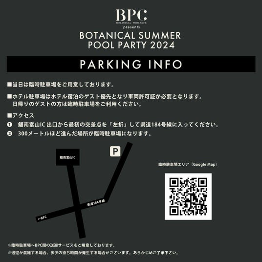 当日は臨時駐車場をご用意しております。ホテル駐車場はホテル宿泊のゲスト優先となり車両許可証が必要となります。日帰りのゲストの方は臨時駐車場をご利用ください。