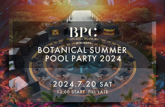 東京から車で70分。昨年千葉・内房にグランドオープンした話題の“プールクラブ”をテーマにしたホテル「BOTANICAL POOL CLUB(以下、BPC)」は、夏の到来とともに初の主催イベントとなる「BOTANICAL SUMMER POOL PARTY 2024」を開催いたします。プールサイドで贅沢なひとときを楽しめる同イベントは、音楽とプール、そしてアイコニックな植物が造る世界を融合した夏の楽園を提供。国内外のトップDJたちが集結し、バレアリックハウスからチルアウトミュージックまで、さまざまなジャンルの音楽が楽しめます。BPC独自の世界感とともに、ミュージック、ドリンク、フードと終日のサマーパーティーをお楽しみください。