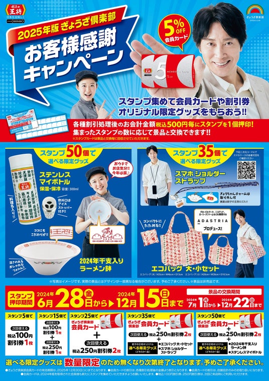 d11353-145-fd1806d624723613e1e80bbc400a926e.pdf株式会社王将フードサービス(本社 京都府京都市 代表取締役社長 渡邊直人)は、2024年6月28日より「2025年版 ぎょうざ倶楽部 お客様感謝キャンペーン」を実施いたします。