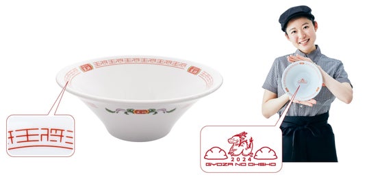 おウチでお店気分が味わえるラーメン鉢。深さのあるオシャレなフォルムです。底には今年の干支である辰と餃子の可愛いイラスト入り。