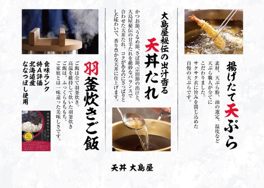 揚げたて天ぷら・大島屋秘伝の出汁香る天丼たれ・羽釜炊きご飯