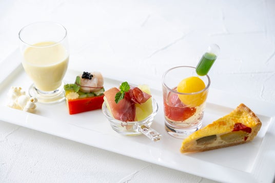 一緒にお楽しみいただくセイボリーは、現代の名工にも選ばれたANAクラウンプラザホテル広島 総料理長、澤村収二が監修。トウモロコシの冷製スープやチェリートマトとコンソメジュレなど、夏らしい爽やかなセイボリーをご用意します。【スイーツ】