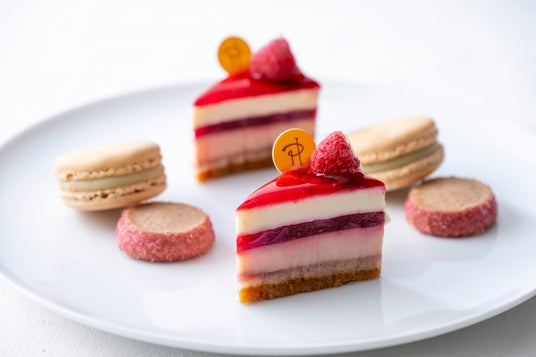 サブレ、フランボワーズ風味ビスキュイ、ローズ風味のベイクドチーズケーキ、ライチ入りフランボワーズのコンポート、ローズ風味クリームチーズムース