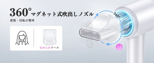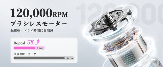 製品:「Bopwavy」マイナスイオンドライヤーは高速モーターが内蔵され、毎分120,000の高速回転を生成、パワフルな風を送る同時に髪に水分を補給します。
