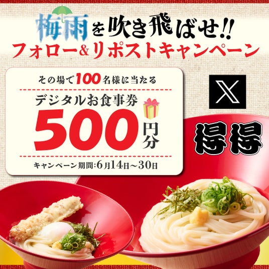 株式会社家族亭(本社・大阪府大阪市、代表取締役社長・坪山 憲司)が運営するうどんチェーン「得得(とくとく)」は、2024年6月14日(金)~6月30日(日)の期間に得得公式Xで「得得デジタルお食事券500円分」が100名様にその場で当たる「梅雨を吹き飛ばせ!」Xフォロー&リポストキャンペーンを実施いたします。雨の日はXキャンペーンに参加して、得得にぜひ来てください。得得の公式Xをフォローし、キャンペーンポストをリポストすることで参加ができ、その場で抽選結果が分かります。「得得デジタルお食事券」は、得得の店内飲食、テイクアウトでご利用いただけますので、得得にご来店お待ちしております♪ぜひこの機会に得得公式Xフォロー&リポストをしてキャンペーンに参加してください。得得公式X(ハート)(いいね)もお願いいたします。