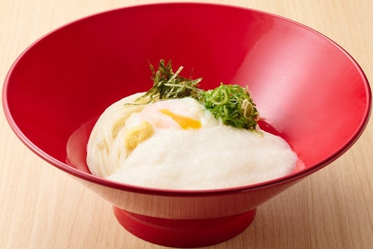 自慢のうどんにとろろと温玉をトップング。得得オリジナルのざるだしをかけてよく混ぜてのど越しつるっとお召し上がりいただけます。