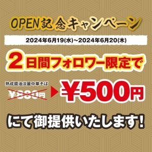 1.Instagram公式アカウントをフォローした方限定で、2024年6月19日(水)~2024年6月20日(木)の2日間で「熟成醤油 淡麗中華そば(¥880)」をワンコイン500円でプレゼント!