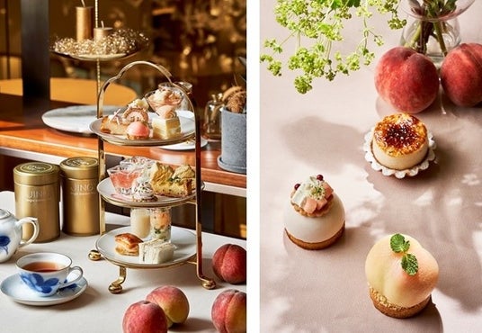 桃の甘さと調和するショートケーキや、桃と紅茶の風味が広がる桃のタルト、ババロアと桃の果肉をのせたピーチメルバ、濃厚な桃のムースなど7種のスイーツを並べます。