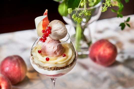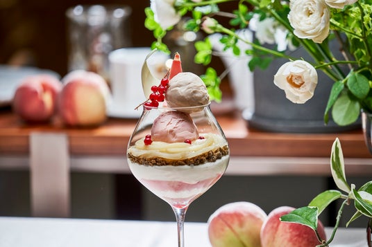 ホテルパティシエがあら川の桃をさまざまにアレンジし、桃と相性のいいアールグレーの紅茶の組み合わせが美味しい、この季節だけのパフェ。