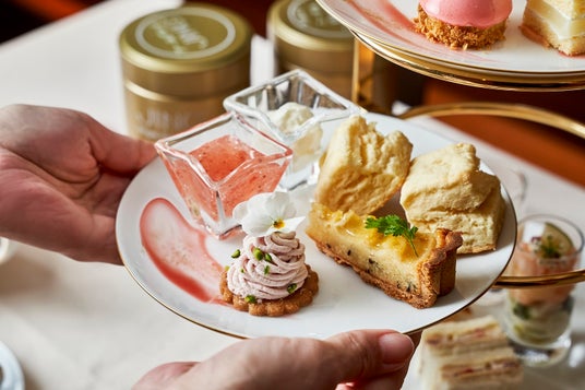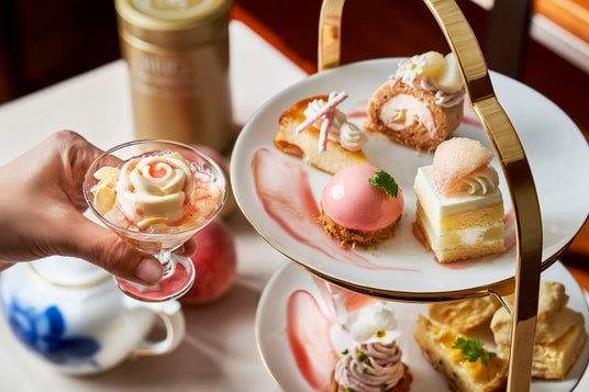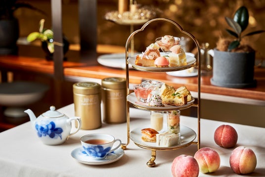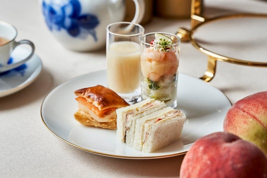 (セイボリー)桃と海老のヴェリーヌ/桃のビシソワーズ/桃とパストラミのサンドウィッチ/桃とスモークサーモンのフィユテ/スコーン(クロテッドクリーム・桃ジャム付き)