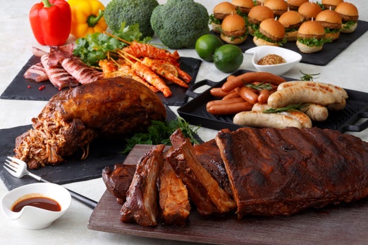 スペアリブ / プルドポークハンバーガー / ソーセージ / 魚介のグリル(イカ / 海老) / 夏野菜 / ピクルス / ナッツ / 鶏の唐揚げ / フライドポテト / カレーライス / フルーツ串 など