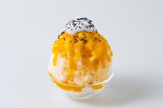 ほうじ茶の香ばしい香りとすっきりとした味わいのシロップの上に、クリーミーな甘さと鮮やかな色が特徴的な安納芋シロップを合わせました。氷の中のナッツと醤油を練り込んだ芋あんには、店頭でも人気の「アコメヤの醤油」を使用し塩味をプラス。ナッツのカリっとした食感がくせになる、秋の訪れを感じるかき氷です。トップの黒ごまホイップが全体の味をまとめ上げます。