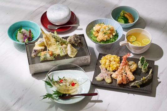 昨年リニューアルしたディナーコース「特選 山の上のおまかせ」内の一品。前菜は旬の味覚の小鉢を2品ご用意。活車海老から始まる天ぷらは魚 介5種、旬菜6種を揃えて、内容は当日のおまかせです。お食事は海老と小柱、三つ葉を使ったかき揚げで、夏限定で提供する「冷やし天茶」が おすすめです。「天丼」「天ばら」もお選びいただけます。