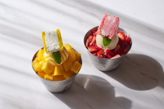 「リアルいちごビンス」は甘くて柔らかい雪のような 氷に、いちごといちごソースの組み合わせ。バニラ アイスの上に人気のいちごミルクのマカロンを乗せ たストロベリーかき氷。「リアルマンゴービンス」はマ ンゴーの果肉をたっぷり乗せた上に、あんずの甘 酸っぱさがポイント。バニラアイスとピュアバニラマカロンまで楽しめるかき氷です。