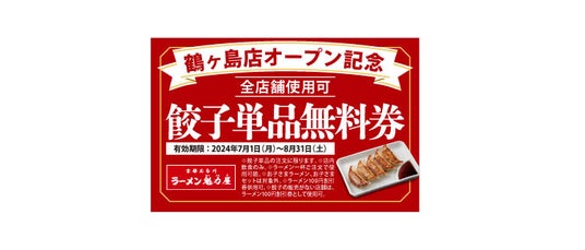 オープンを記念して、「鶴ヶ島店」にご来店いただいたお客様には全店舗でご使用いただける餃子単品無料券を配布いたします。