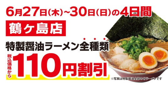 この度オープンを記念して、「鶴ヶ島店」にご来店いただいたお客様には、『特製醤油ラーメン全種類』を税込価格から110円割引で販売いたします。