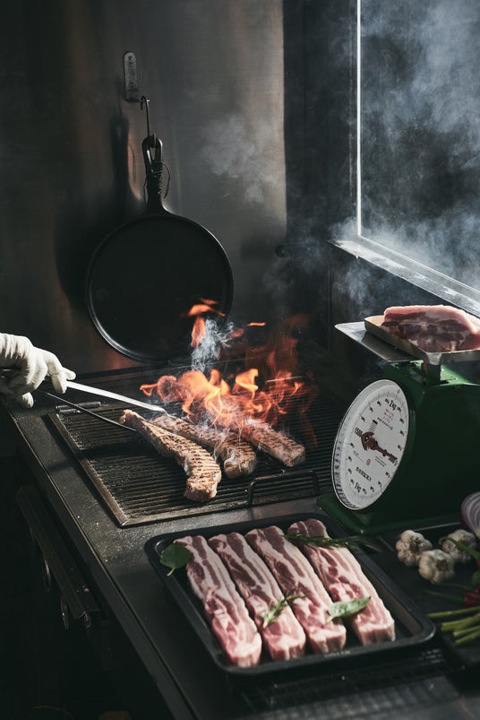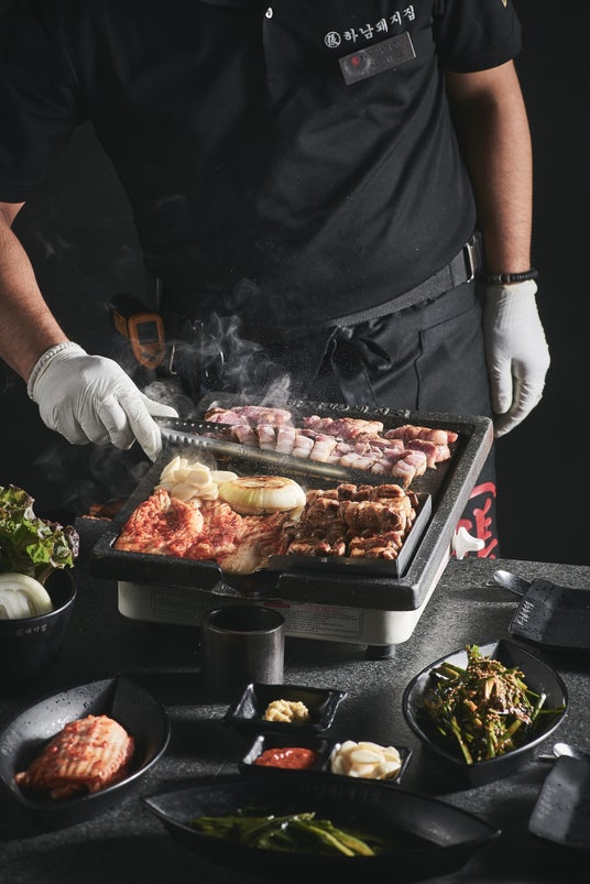 韓国のNO1プレミアムサムギョプサルブランドである?????(ハナムデジジップ)は、500度の炭火で下焼きをすることで豚肉本来の味を閉じ込めたのち、お客様の目の前でカットし、表面を焼きあげるパフォーマンスで、お客様に五感で楽しんでいただく体験型の提供スタイルがシグネチャーとなっております。肉の厚み・品質はもちろん、焼く際の最適な温度・時間を徹底管理し、いつでもどこでも変わらぬハイクオリティなサムギョプサルを提供しております。