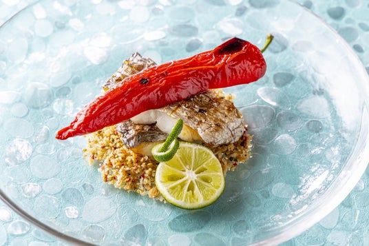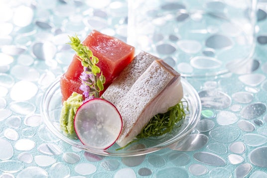 先付けにはとうもろこしを丁寧に裏ごした「玉蜀黍(とうもろこし)豆腐」をつるんとした歯ごたえのじゅんさいと共にご賞味ください。2種類のお造りの後は、夏に旬を迎える脂がのった太刀魚を芳ばしく焼いた「太刀魚塩焼き サクサクパン粉添え」をお楽しみいただけます。