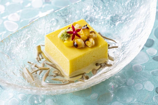 キャビアを乗せた牡丹海老やイクラ、サーモンなど7種類のてまり寿司は、ネタに合わせて赤酢や白酢シャリを使いわけてご用意しています。1つ1つ丁寧にお作りするてまり寿司を目と舌でゆったりとお楽しみいただいた後には上質な国産煎茶をベースに、香り高いバラやラベンダー、金木犀などの花をブレンドしたヒルトン東京オリジナル花煎茶と共に「メロン&マンゴーのパフェ」をどうぞ。フレッシュマスクメロンとマンゴーを贅沢に用いたパフェは、メロンムースやマンゴーゼリー、レモンマカロンなどが彩り美しく配され、爽やかな食後のスイーツとして最適です。