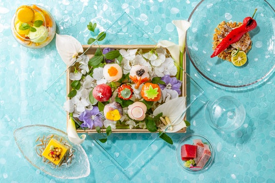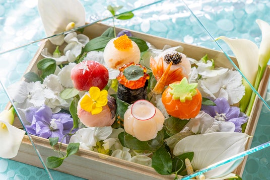 フォトジェニックなアフタヌーンティー気分で楽しむ華てまり寿司は、ご友人との華やいだランチはもちろん、大切な方のお祝いや記念日にも最適です。花束を贈るように、「華てまり寿司」で夏の美食の贈り物はいかがでしょうか。
