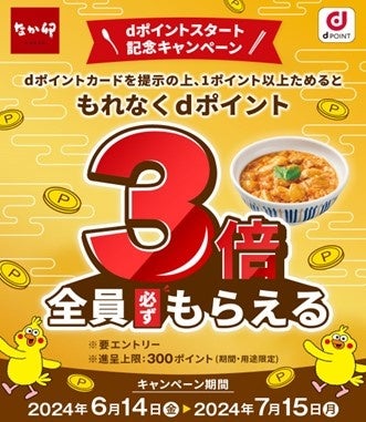 期間中に本キャンペーンサイトよりエントリーの上、なか卯の対象店舗でお会計の際に、レジもしくは券売機にてdポイントカードをご提示の上1ポイント以上ためると、もれなくdポイントを3倍(通常ポイント1倍+キャンペーンポイント2倍)進呈いたします。キャンペーンポイントは通常ポイントとは別に後日進呈いたします。[キャンペーン対象の方]