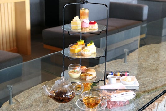 上質な語らいをテーマにしたラウンジは、目の前の熱海サンビーチの賑わいからは全く想像もできない優雅さと静寂に満ちていま す。また伊豆特有の漆?の溶岩石で作られた水盤には、季節ごとに花が生け入れられゲストをお迎えし、ホテルラウンジ ならではのエレガントなひとときをご堪能いただけます。契約農園で茶樹を育成し自社工場で製茶を行う地元静岡のクラフト紅茶「静岡紅茶」、ドイツの歴史ある紅茶メーカー「ロンネフェルトティー」などと共に、国内の名店で腕を磨いた パティシエがつくるスイーツと共に心落ち着くひと時をお過ごしください。