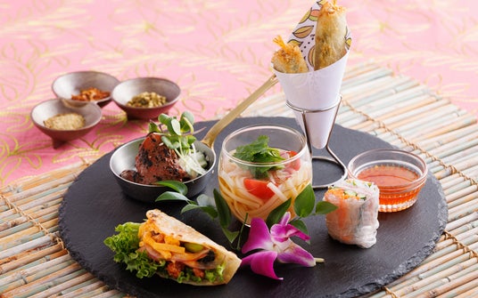スモークサーモン、カスラーハム、春雨サラダと彩り野菜で仕上げました。スイートチリソースでお召し上がりください。