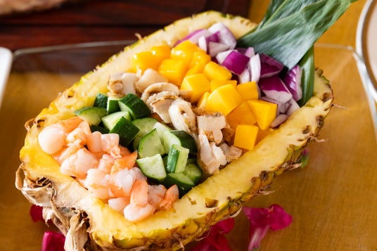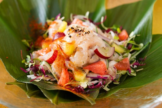 メインメニューには定番のガーリックシュリンプやフリフリチキン、ポリネシアで高級魚として扱われるシイラを使ったマヒマヒと夏野菜のカレー風味のクリームソース、豚肉とパイナップルのブレゼ、鴨胸肉のはちみつ焼き ココナッツの香り、ハワイ風ラーメンと言われるサイミンなど、バリエーション豊かなラインアップを取り揃えました。冷製料理には、刺身と野菜をココナッツミルクでマリネしたポワソンクリュや、タロ芋とタピオカの冷製スープ、さつまいもとキウイのカプレーゼ風フェタチーズのせ、バナナフリッターのエスカベッシュなど、夏にぴったりの彩り鮮やかな料理の数々をご堪能いただけます。