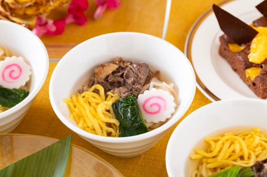 ポリネシアとは太平洋の中心に位置するハワイと、南のニュージーランド、東のイースター島を結んだ三角形の海域で、ハワイやフィジー、タヒチ、サモア、トンガなどが含まれるエリア。太平洋の島々ならではの豊かな海の幸たっぷりのシーフード料理や、豚肉や牛肉、トロピカルフルーツを使ったダイナミックな料理など、伝統的なポリネシア料理にフランス料理の技法やアジアのテイストが融合した料理の数々がブッフェ台に並びます。天井が高く開放的な雰囲気の店内を、ヤシの木やハイビスカスなどで装飾。スタッフはアロハシャツを着用し、南国ムードでお迎えします。またバー「カルーザル」では、「ベルテンポ」のシェフによるハワイ・ポリネシアンフェアの料理とドリンクをセットにしたお得なプランもご提供します。