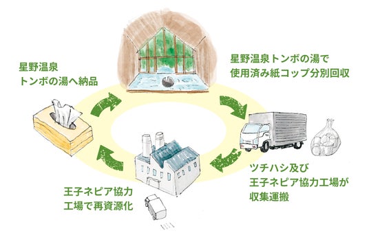 国内外に70施設を運営し、旅を楽しくする星野リゾート(長野県軽井沢町、代表:星野佳路)が運営する源泉かけ流しの日帰り温泉施設「星野温泉 トンボの湯」(以下、トンボの湯)では、2024年7月1日より、王子ホールディングス株式会社(東京都中央区、代表取締役社長:磯野裕之、以下、王子ホールディングス)とグループ会社の王子ネピア株式会社(東京都中央区、代表取締役社長:森平高行、以下、王子ネピア)の紙コップリサイクルシステムを通じて、飲泉、飲水に使用した、使用済み紙コップをハンドタオルへ再資源化する活動を始めます。