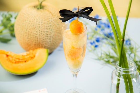 アリスリボンの特製スパークリング ~フレッシュメロンを添えて~ 1,380円(税込) 乾杯酒にピッタリな爽やかなアルコールドリンク。メロンの実の濃厚な甘さがスパークリングワインと調和しています。