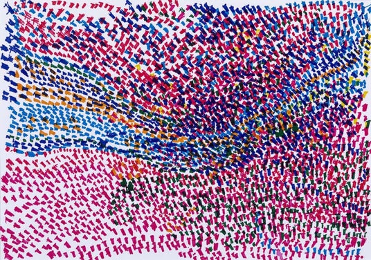 彼女の制作には、瞑想から生み出されるような果てしなさがある。完成形を目指して作り出しているのでなく、思いのままに打っていく点描や短い線の集積に何かを見出し、その世界にとめどなく没入して行く。ある時はふわふわと、夢見るように周囲の誰かに笑顔で話しかけ、またある時は、一人自分の内側の世界に深く意識を沈めてる。そのまなざしは、彼女の心だけに映る何かを追いかけてたゆたう。不思議な空気が彼女と彼女の制作には漂っている。