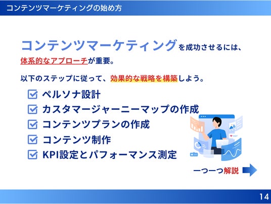 コンテンツマーケティングを始める手順は以下の通りです。